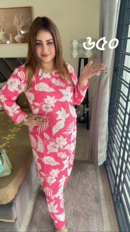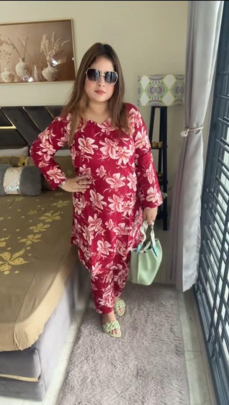 প্রিমিয়াম ফ্লোরাল ড্রেস রানী গোলাপী কালার কুর্তি সেট।
